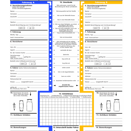 Ein Kfz-Unfallbericht dient der sachlichen Dokumentation eines Verkehrsunfalls für die Versicherung oder die Polizei. Wir empfehlen immer ein Exemplar im Handschuhfach dabei zu haben.